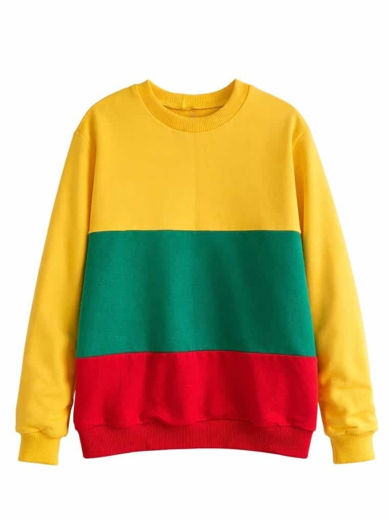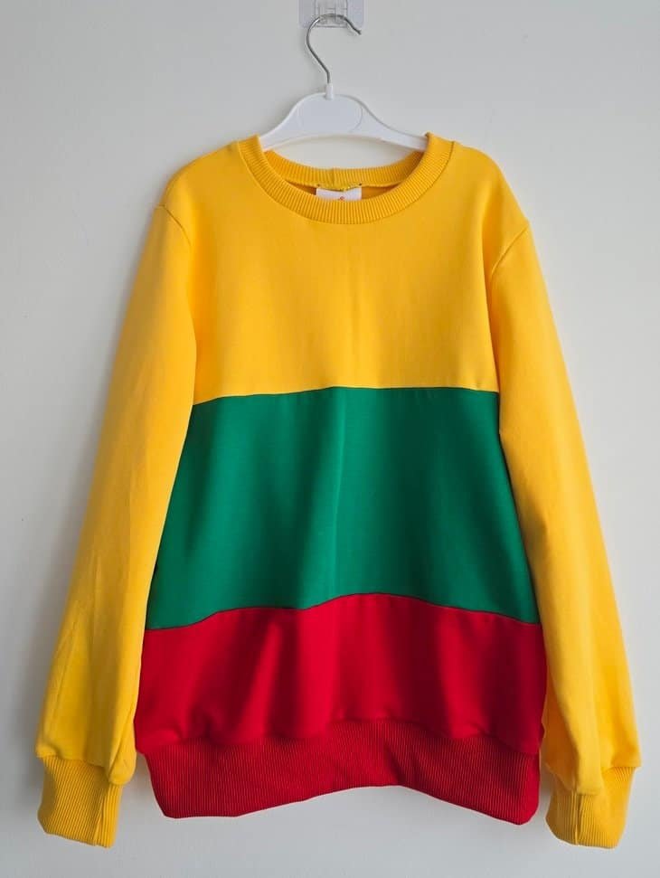 Patriotiškas džemperis iš Lietuvos vėliavos spalvų priekyje ir geltonos spalvos nugaroje.